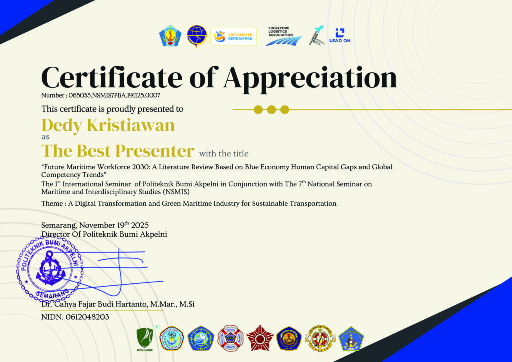 3. Transformasi Sistem Manajemen Sumber Daya Manusia Maritim melalui e-Crewing untuk Mengatasi Kelangkaan Pelaut Global, Oleh: Sugeng Marsudi, ST., MM., M.Mar.E & Dedy Kristiawan, ST., MM