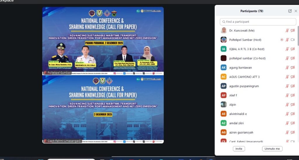 Sahabatmaritim.com– Padang Pariaman, 2 Desember 2025 — Politeknik Pelayaran (Poltekpel) Sumatera Barat sukses menyelenggarakan National Conference & Sharing Knowledge (Call for Paper) dengan tema “Advancing Sustainable Maritime Transport: Innovation, Green Transition, Port Management and Net Zero Emission.” Kegiatan ini mendapatkan antusias tinggi, dengan total 380 peserta, terdiri dari 160 peserta online dan 220 peserta offline.